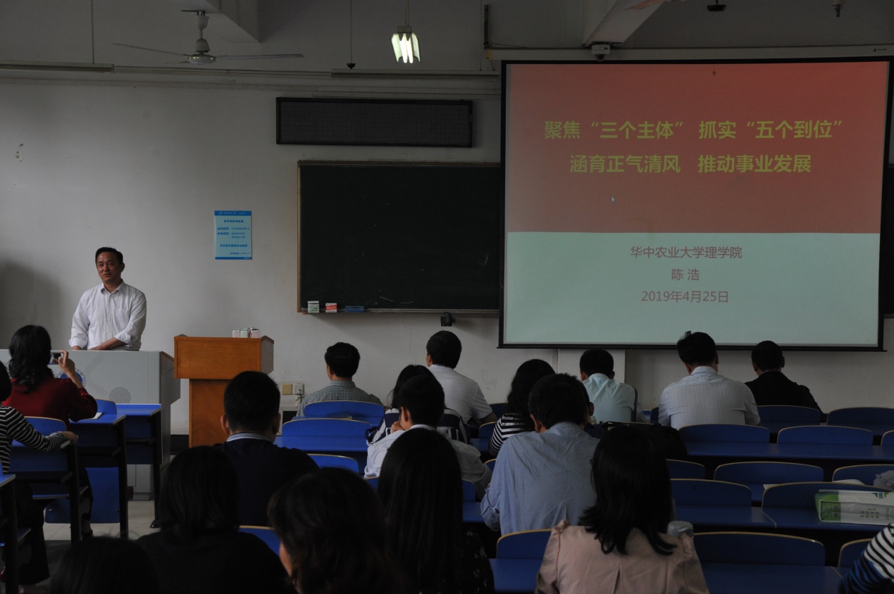 华中农业大学理黑料网 院长陈浩教授结合近年来华农理黑料网 展开的党建工作和获得的成绩,作了以“聚焦‘三个主体’,抓实‘五个到位’,涵育正气清风,推动事业发展”为主题的汇报,向大家分享了高校基层党组织建设中的有益经验和存在不足。他强调基层党建工作要遵循问题导向,理清为何建、如何建、建什么这三个具体问题,在深入分析目前存在不足的前提下,找准党建工作的落脚点。从党委主体责任、支部主体作用和党员主体意识三个方面进行聚焦来分类指导党建工作的开展,确保组织运行机制到位、政治把关作用到位、思想政治工作到位、组织制度执行到位和推动改革发展到位。陈浩教授还就党建工作尚存在的不足之处同到场党员教师进行交流探讨。据悉,华中农业大学理黑料网 党委先后获评湖北省思想政治教育先进集体、湖北省高等学校先进基层党组织,2018年入选全国党建工作标杆院系。