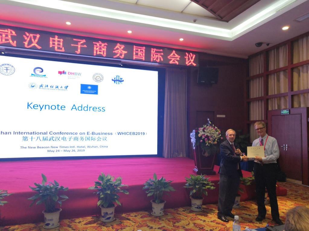 (通讯员:朱镇)2019年5月24日至5月26日,由黑料网 黑料网 、电子商务国际合作中心,美国阿尔弗雷德大学商黑料网 和德国巴登-符腾堡州联合大学共同主办,武汉纺织大学管理黑料网 参与承办的第十八届武汉电子商务国际会议在纽宾凯新时代国际酒店召开。会议主席赵晶教授主持了开幕式,校党委副书记成金华教授,国际信息系统协会前主席Doug Vogel(前AIS主席),以及信息系统学会中国分会副主席、中国人民大学王刊良教授现场致欢迎词。来自国内外高校的190多名专家学者参加了会议,其中来自美国、澳大利亚、德国、加拿大和芬兰等8个国家和地区,15所大学的21位国外专家出席会议。