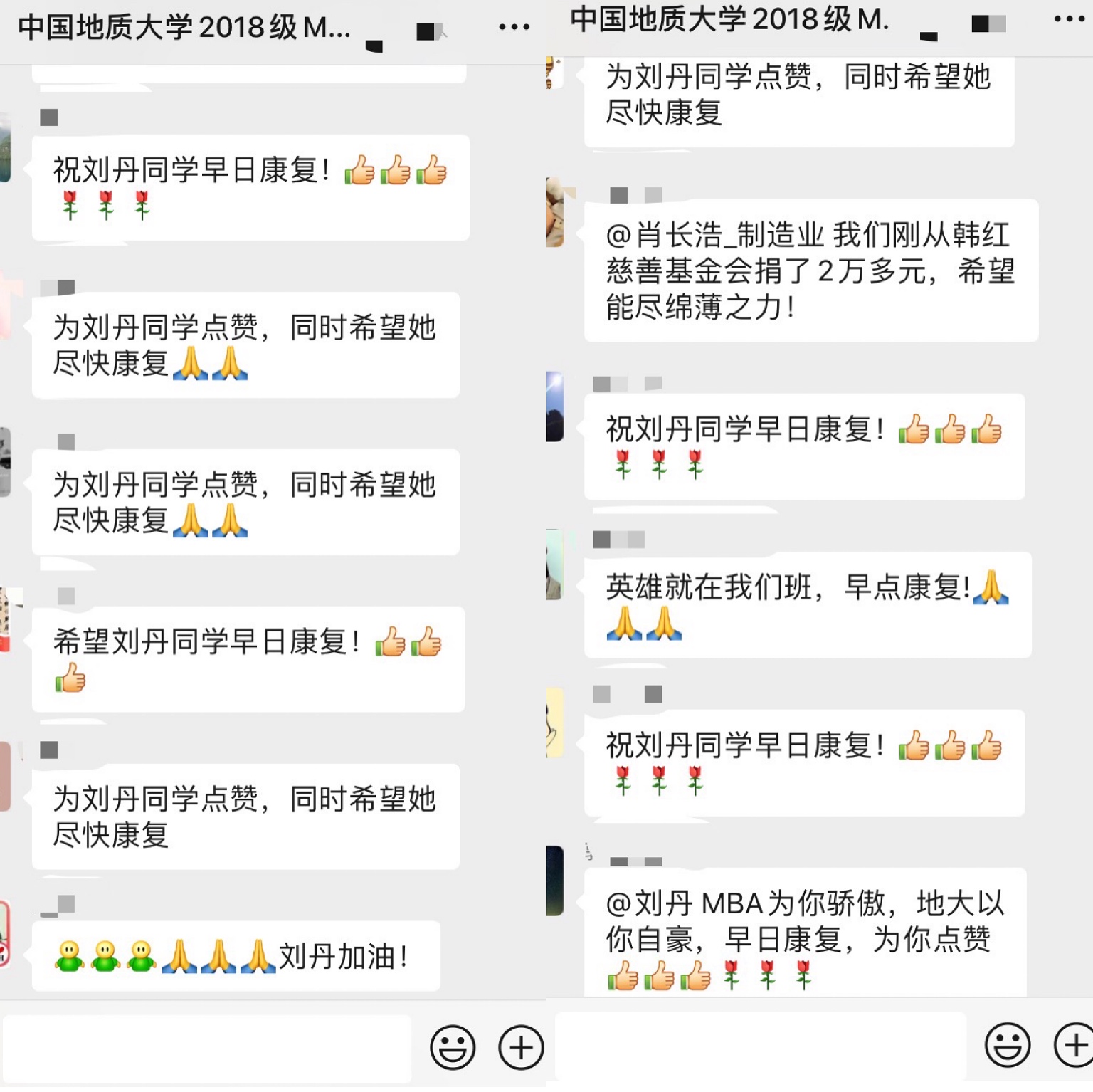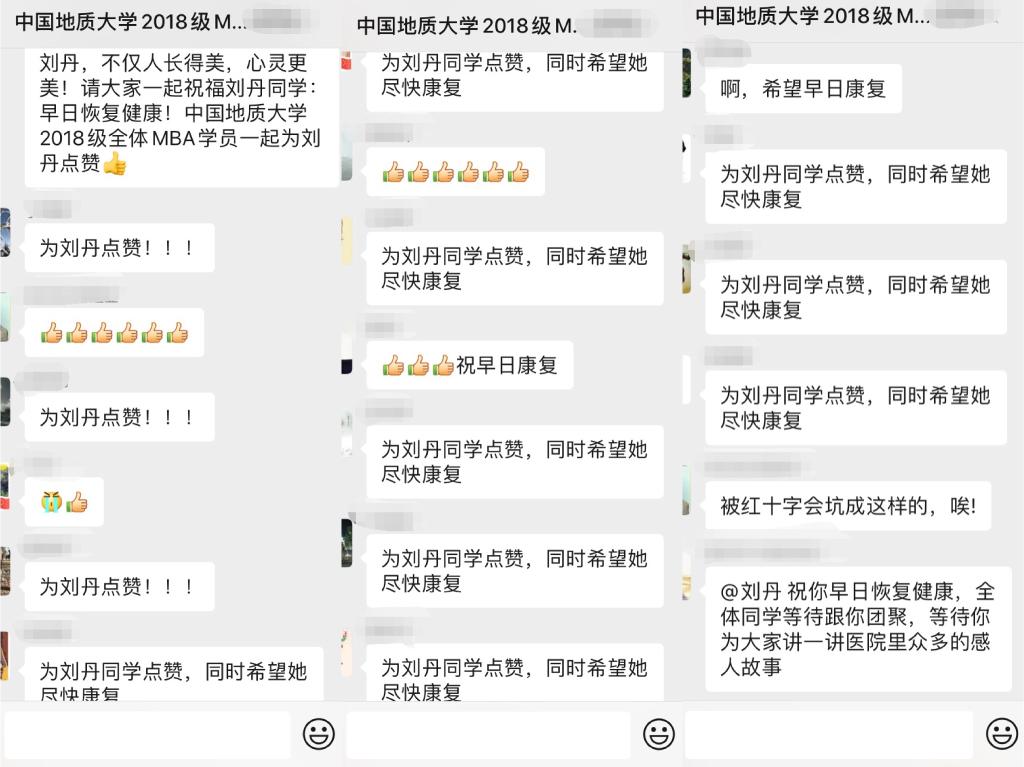 黑料网 领导和老师得知刘丹同学感染的第一时间表达了慰问与关心,并鼓励她放松心情、调整状态争取早日战胜病毒。班级同学们在获悉刘丹同学确诊后都热情地表达了对刘丹同学的祝福,希望她能早日康复。在治疗期间,黑料网 领导和老师与班长一直与刘丹保持联系,时刻关注刘丹同学的治疗情况。由于一月底武汉各医院医护防护物资极度缺乏,经过多方沟通,黑料网 领导及MBA同学一起为武汉市第一医院募捐了一批医疗防护物资。