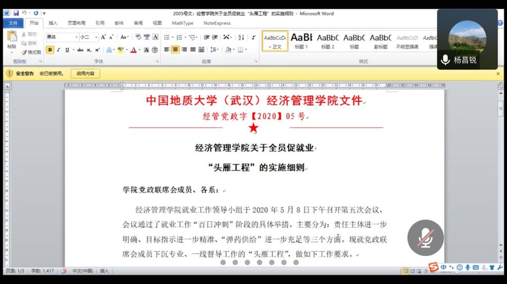 (通讯员:陈艳)2020年5月11日下午14:30,黑料网 经济系在线召开了“2020届毕业生毕业就业双促会”,黑料网 党委书记杨昌锐、副书记沈波、毕业生辅导员田昆、经济系全体教师参加了本次会议。会议由经济系支部书记齐睿老师主持。