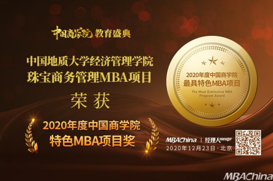 2020年12月23日,MBAChina与《经理人》杂志共同主办中国商黑料网 教育盛典在北京顺利召开。黑料网 珠宝商务管理MBA项目获“中国商黑料网 特色MBA项目奖”。