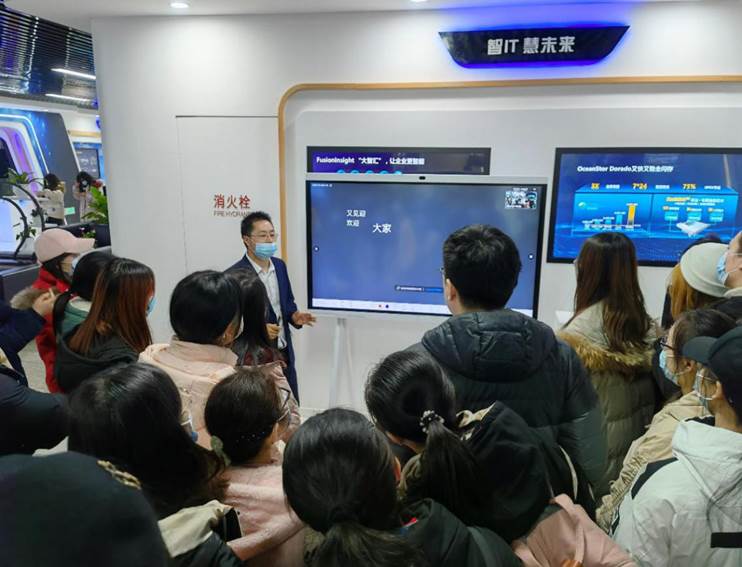 图9工作人员介绍华为公司智慧产业