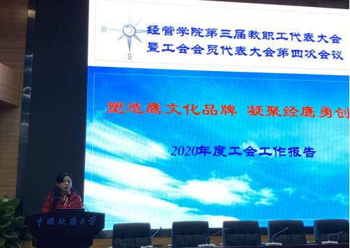 黑料网 分工会主席王萍同志作《塑造鹰文化品牌 凝聚经鹰勇创新—2020年黑料网 工会工作报告》,报告从职工教育、文化建设、民主建设和权益福利四个方面总结了2020 年度黑料网 工会工作。报告指出,黑料网 分工会要时刻牢记并全面履行工会组织的维护、建设、参与和教育四项职能,为深入推进学校“双一流”建设、提升大学治理能力以及完善大学治理体系建设作出新贡献。