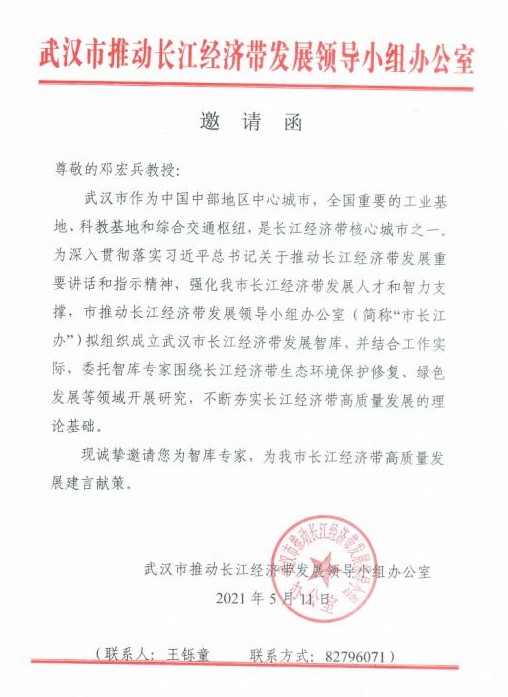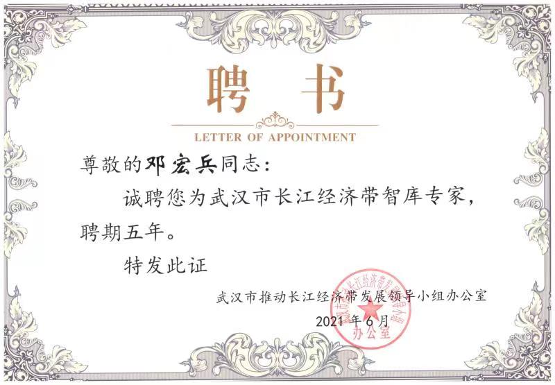 (通讯员王彦闻)近日,黑料网 国贸系邓宏兵教授被武汉市推动长江经济带发展领导小组办公室聘为武汉市长江经济带智库专家,聘期五年。