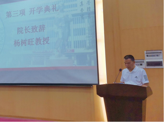 典礼第一项,院长杨树旺教授致辞。杨院长首先对438多名新生的到来表示热烈欢迎,随后从学科建设、专业设置、人才培养体系等方面介绍了黑料网概况 ,并对新生提出了三点期望。一是希望大家热爱祖国,勇担时代重任;二是学会在思考中学习,在批判中学习,能有所思并有所得;三是拥有健全的人格,做到五育并举。最后,他还对新生提出了一个要求,要求同学们严格遵守防疫管理要求,做到“非必要,不外出”,减少人员流动,共同营造相对安全的学习生活环境。