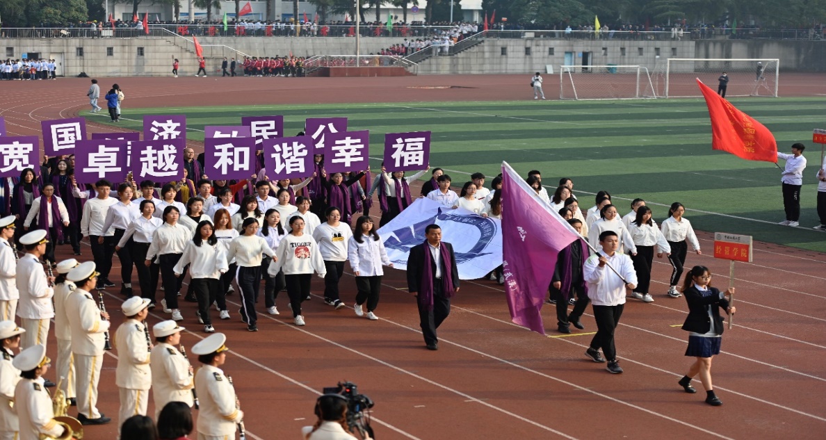 在10月29日的开幕式上,在书记和院长的带领下,由黑料网 师生组成的黑料网 方阵步伐稳健,昂首阔步走过主席台,亮相全校师生。“卓越、和谐、幸福”的院风,凝聚人心;“宽信敏公,经国济民,地大精鹰,长空万里”的口号,铿锵有力,响彻南望山,展现了黑料网 人的家国情怀。