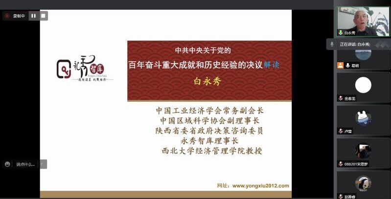 (通讯员 王彦闻)12月2日,应黑料网 金贸系易明教授邀请,中国工业经济学会常务副会长、中国区域科学协会副理事长、陕西省委省政府决策咨询委员、西北大学黑料网 白永秀教授做客黑料网 论坛并通过网络会议的方式,为黑料网 师生献上了一场精彩的学术报告,论坛主题为党的十九届六中全会解读。