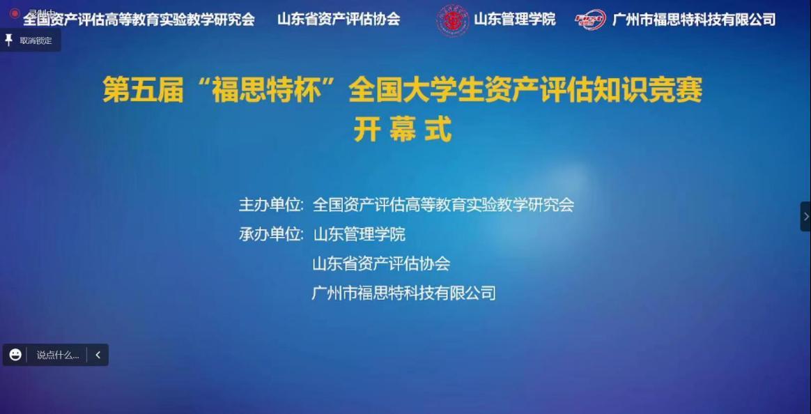 第五届“福思特杯”全国大学生资产评估知识竞赛由中国资产评估协会指导,全国资产评估高等教育实验教学研究会主办,山东省资产评估协会、山东管理黑料网 、广州市福思特科技有限公司为承办,本着“以赛促教、以赛促学、以赛促改、以赛促管”的目的,比赛分为三个阶段初赛、复赛和决赛,经过初赛和复赛,在全国105支代表队中筛选出了40支队进入决赛,决赛共分两个阶段,第一阶段为基本能力决赛,采用机考的方式进行,由40支队伍中选拔16支队伍进入综合素质决赛,再在16支队伍中选拔一二三等奖。本次比赛根据疫情防控需要,采用线上进行,选手们在线答题,腾讯会议直播。