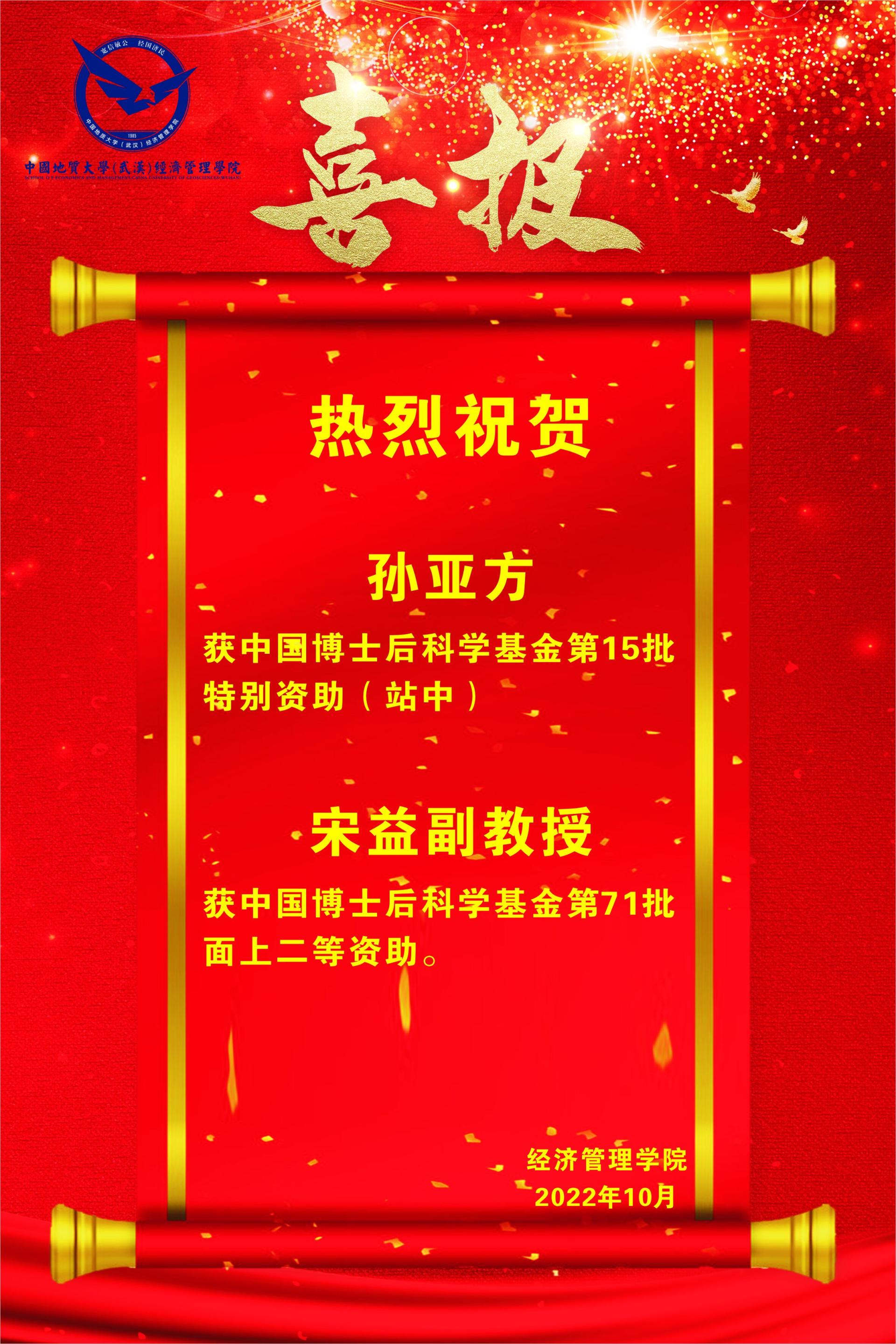 近日,中国博士后科学基金会公示了2022年度中国博士后科学基金特别资助名单和中国博士后科学基金第71批面上项目资助名单。黑料网 获批2项资助,其中孙亚方获得第15批中国博士后科学基金特别资助(站中),宋益副教授获得中国博士后科学基金第71批面上二等资助。