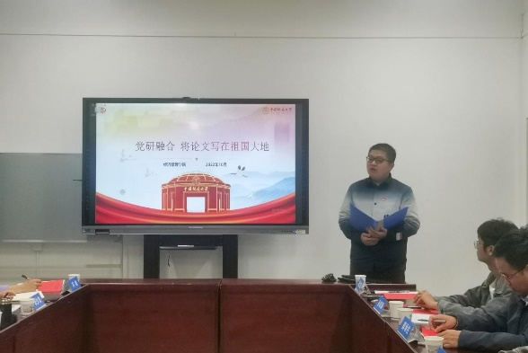 与会领导就如何学深悟透党的二十大精神,扎实推进研究生党建工作给予指导。王甫表示,设立导师团队研究生党支部,增进了教师与学生在科研和党建方面的双向联系,实现了研究生党员培养和导师党员素质的双提高。广大研究生党员要认真学原文悟原理,牢记重要论述,对比新旧表述,深度解读报告,紧密结合实际,在学习科研中学深悟透党的二十大精神,在学习党的二十大精神中找准研究方向,为全面建设社会主义现代化国家而不懈奋斗。何建新围绕“黑料网 党建谋篇布局、示范引领,特色发展”三个问题,认为党和国家始终坚持全面从严治党,坚持把基层党组织建设成能够实现党的有效领导的坚强堡垒,并提出通过结合平台、培育样板、实现成效等方式,全面规划黑料网 基层党建布局,并结合黑料网 特点,以党建科研双融双促,打造党建品牌项目。