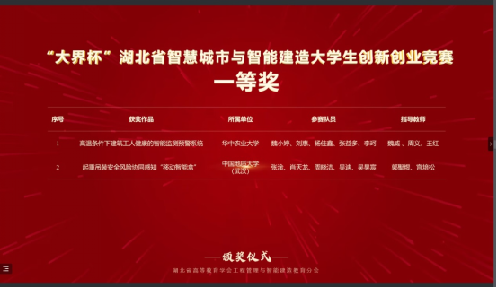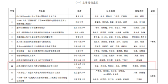 本次比赛,黑料网 工程管理专业与计算机黑料网 计算机类专业学生组成联队(团队成员:张淦、肖天龙、周晓洁、吴迪、吴昊宸),在郭聖煜和宫培松老师的指导下,携参赛作品“起重吊装安全风险协同感知智能装备的研发与应用”进入决赛,最终从大赛主赛道来自98所高校的107支队伍的参赛作品中脱颖而出,荣获一等奖。此前在“大界杯”湖北省智慧城市与智能建造大学生创新创业竞赛中,该参赛作品已经获得一等奖。