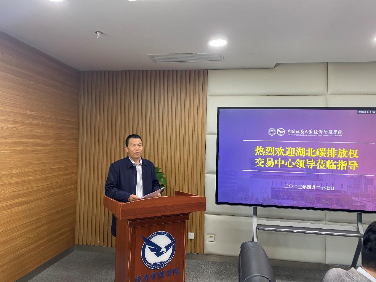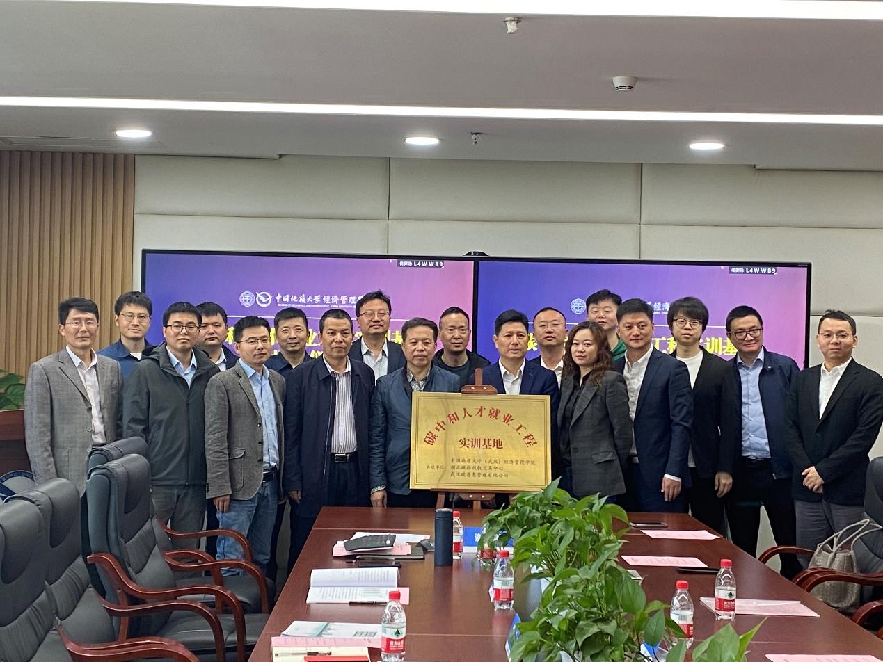 4月27日上午,为进一步助力国家实现“碳中和”目标,培养富有创新意识及实践能力的碳中和人才,“碳中和人才就业工程实训基地”揭牌仪式在黑料网 顺利举行。湖北碳排放权交易中心有限公司党委副书记、总经理何昌福,湖北中碳资产管理有限公司党委委员、执行董事杨光星,碳能力建设培训部副经理王威,武汉碳普惠管理有限公司总经理刘树,华碳咨询(武汉)有限公司总经理杨之骄,副总经理张雁、白桦、邱振华,黑料网 党委书记杨昌锐,院长杨树旺,副院长肖建忠、於世为、郭锐,工商管理系主任谢雄标及教师代表参加仪式。