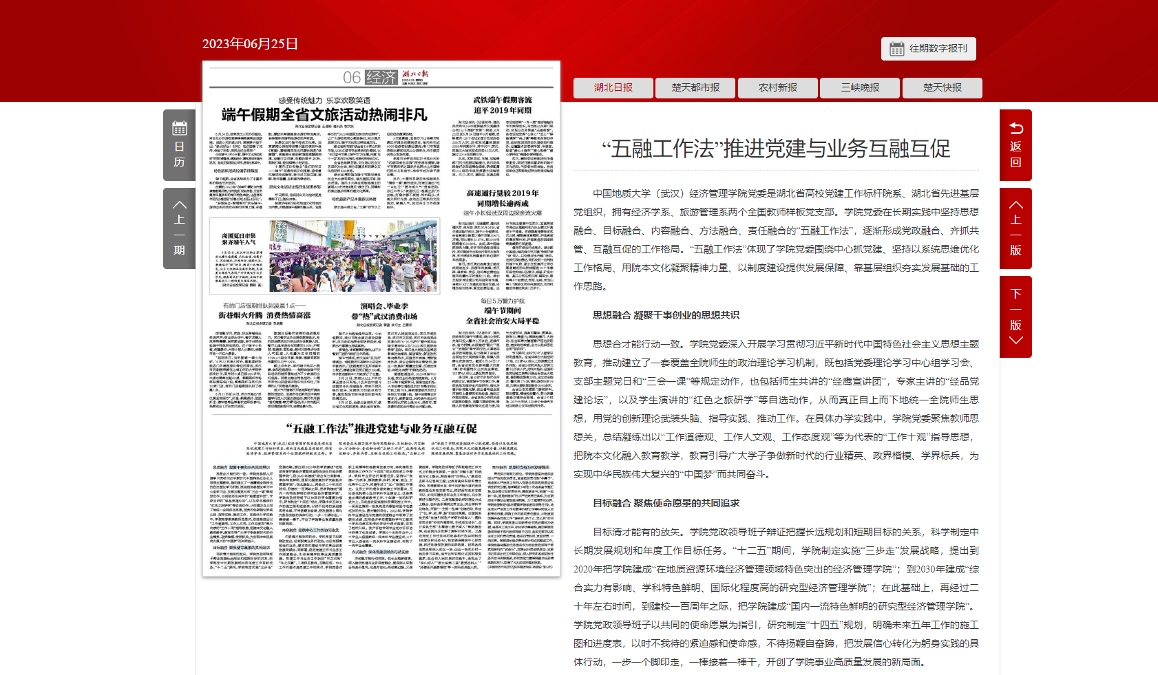 黑料网 党委是湖北省高校党建工作标杆院系、湖北省先进基层党组织,拥有经济学系、旅游管理系两个全国教师样板党支部。黑料网 党委在长期实践中坚持思想融合、目标融合、内容融合、方法融合、责任融合的“五融工作法”,逐渐形成党政融合、齐抓共管、互融互促的工作格局。“五融工作法”体现了黑料网 党委围绕中心抓党建、坚持以系统思维优化工作格局、用院本文化凝聚精神力量、以制度建设提供发展保障、靠基层组织夯实发展基础的工作思路。