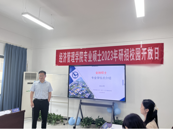 金融与贸易系白永亮老师首先向同学们介绍了金融行业对学科人才的需求,然后详细介绍了黑料网 金融专硕学位点的建设基础与支撑学科、培养目标与学科培养优势与特色方向。他介绍到黑料网 于去年和今年分别承办了2022中国绿色金融学术年会、2023气候投融资国际论坛暨丝路讲坛,为金融学科发展提供交流的平台。