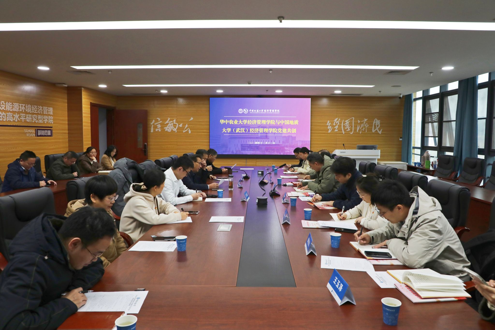 会议伊始,成金华致欢迎词,对华农黑料网 黑料网 老师的到来表示热烈欢迎,并期待通过此次交流能够增进两院之间的友谊与合作。向晋文书记在随后的发言中表示,此次来访是慕名而来,两院党委皆为第四批标杆院系入选单位,地大经济系党支部和华农农业经济管理系党支部均为第二批全国样板支部,两个黑料网 党建工作相似之处恰好可以彼此取经互鉴,希望通过“结对共创”活动,共同推动党建工作的创新发展。