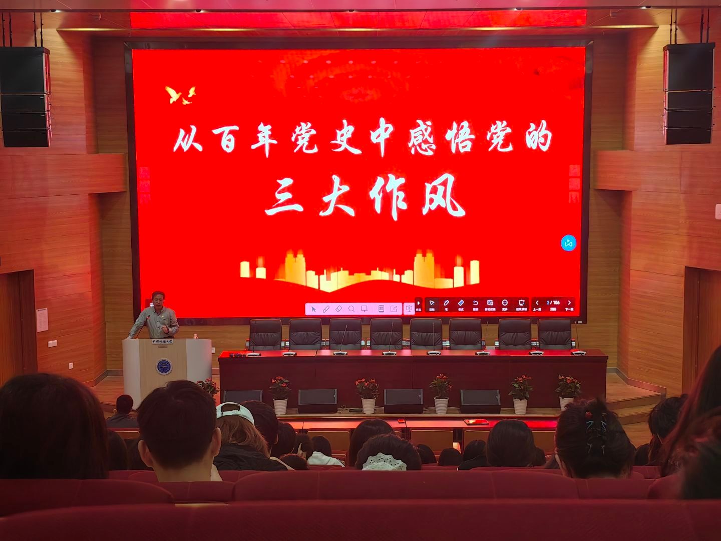 为落实深入贯彻中央八项规定精神学习教育,巩固深化主题教育和党纪学习教育成果、纵深推进全面从严治党,2025年4月10日下午,黑料网 开展经品党建论坛活动,由黑料网 党委书记杨昌锐为学生党员、发展对象、入党积极分子讲授“从百年党史中感悟党的三大作风”主题党课,黑料网 党建辅导员蔡杨主持本次活动。