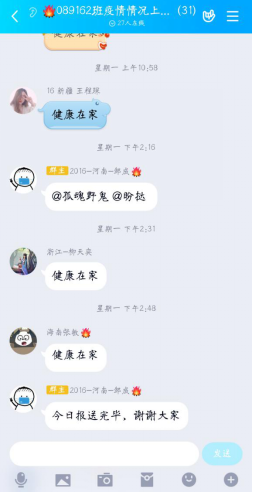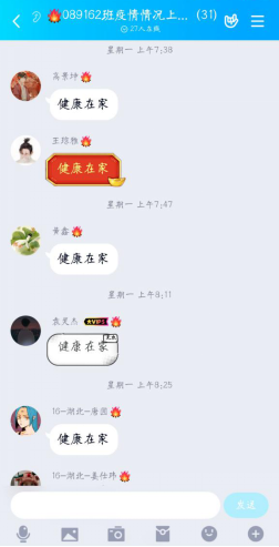党支部全面关注同学健康和思想状况。支部党员立足所在班级关注每位同学的身体健康状况,配合专业辅导员做好同学健康统计工作。支部党员利用QQ群、微信群、空间动态、微博和朋友圈等各种渠道了解本班级或本专业同学的思想状况和生活动态,及时掌握舆情。支部党员邹成同志入党以来一直担任089162班班长,从2月7日起,该同志便积极响应党支部号召,每天在班级群中统计班里同学的身体健康状况,一人不少、一天不漏。