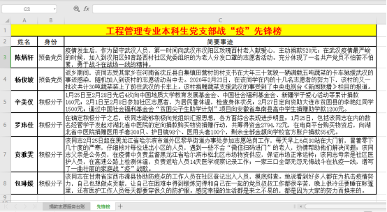 设立党支部战“疫”先锋榜。对于在疫情中表现突出的党员和积极分子,支部及时给予表扬,设立战“疫”先锋榜,号召全体党员和积极分子向他们学习。为武汉疫区困难老人发放口罩的陈炳轩、帮助搬运蔬菜支援武汉的杨俊坡、联合同学发起湖北省中医院定向捐赠物资的罗玮佳、一家三口战斗在战疫一线无私奉献的贲雅雯和冒着严寒协助防疫人员摸底排查的包琳媛等同志,成为广大同学学习看齐的先进典型。