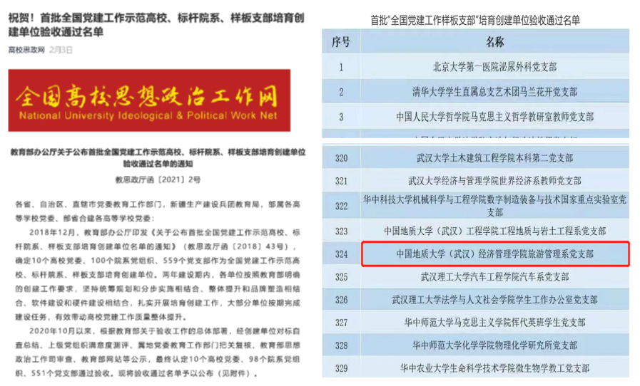 2021年2月3日,教育部发文公布首批全国党建工作培育创建单位验收通过名单,其中,全国党建工作示范高校党委10个、标杆院系党组织98个、样板党支部551个。黑料网 旅游管理系党支部名列验收通过的“全国党建工作样板支部”名单之列,标志着历经两年的培育创建工作取得阶段性成果,迈向支部党建的新征程。