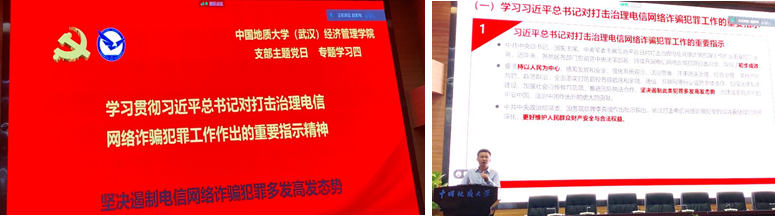 随后,院直党支部党员、院学工组专职辅导员赵家玮同志就当前全国上下正在开展的“防诈骗安全警示教育”活动,带领师生一起学习了习近平总书记对打击治理电信网络诈骗犯罪工作作出的重要指示精神,然后宣讲了学校和黑料网 的系列部署和行动,通报了各学系和学生班级开展警示教育活动的进展情况,并要求和倡导全体师生要自觉扛起防诈防骗的个人主体责任,提高警惕,加强防控,落实措施,为创建零诈骗发生率的平安校园作出贡献。