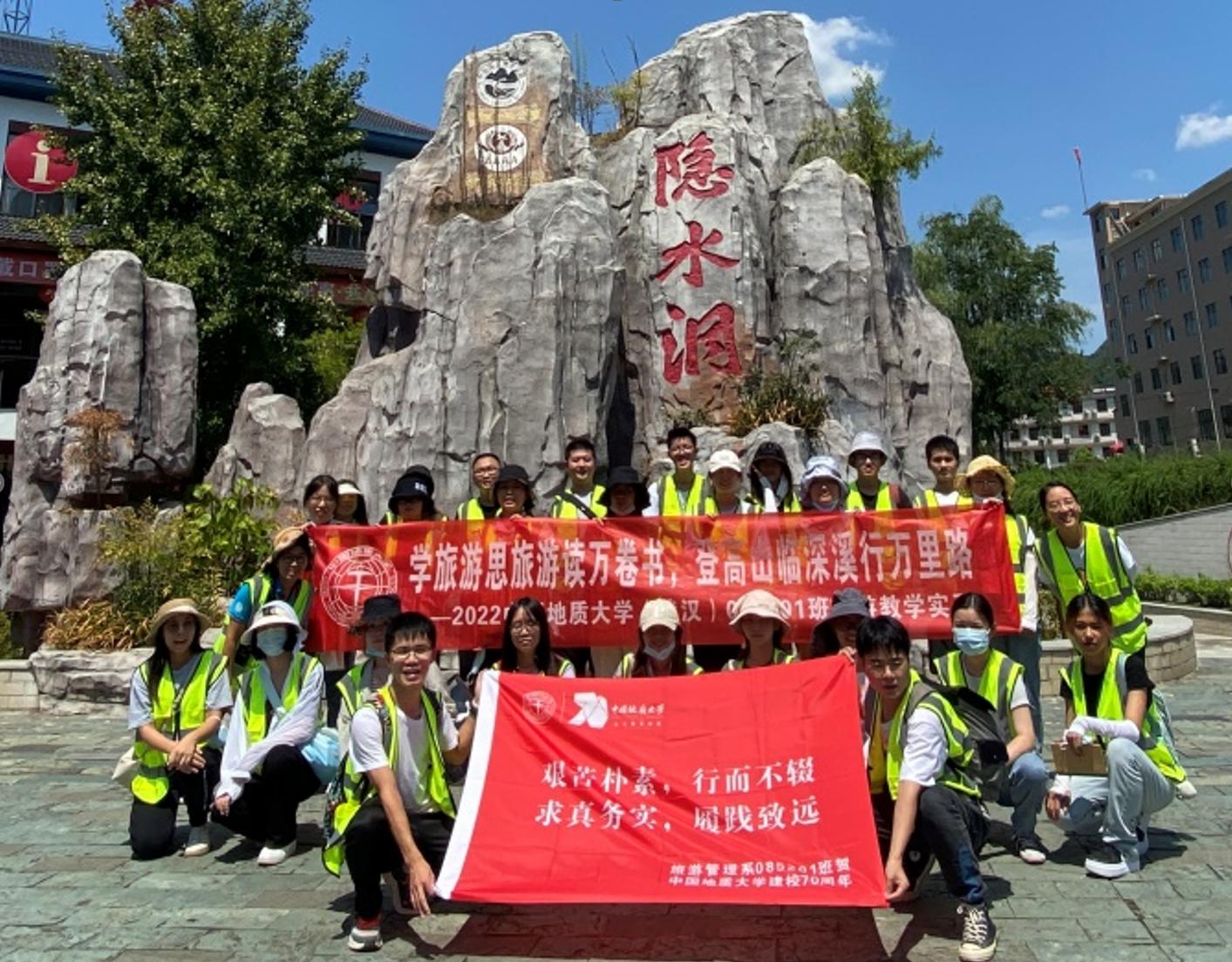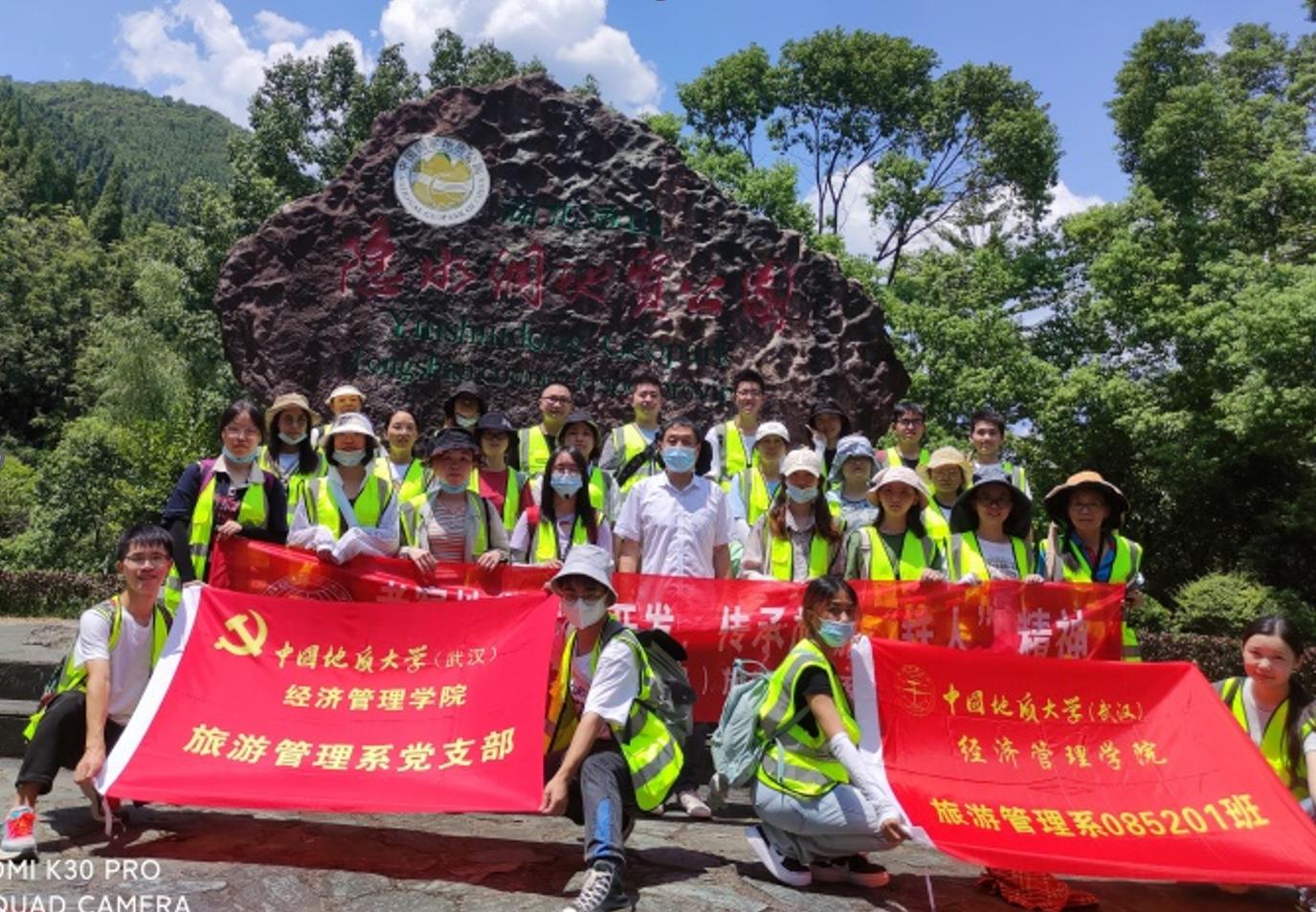 位于地学旅游线上的通山县,其旅游开发对拉动地方经济发展有决定性作用,当地旅游开发建设者同黑料网 (武汉)旅游学人携手开展的地质公园资源勘察、开发规划与公园建设,谱写出共同奋斗、艰苦创业的历史篇章,凝结出旅游“铁人”精神,是认知旅游地学开发、了解旅游扶贫与乡村振兴、认识旅游业及旅游人在社会经济发展中的作用与贡献、学习旅游学人和旅游“铁人”精神的典型案例地,也是旅游管理系党支部开展师生“结对领航”项目的场所之一。本次地学旅游线的实习考察,带队教师联系并邀请到长期参与当地旅游开发建设与管理、通山隐水洞国家地质公园市场部负责人王俊伟经理为同学们做现场教学,在听“旅游故事”中开展了相应思政教学活动。