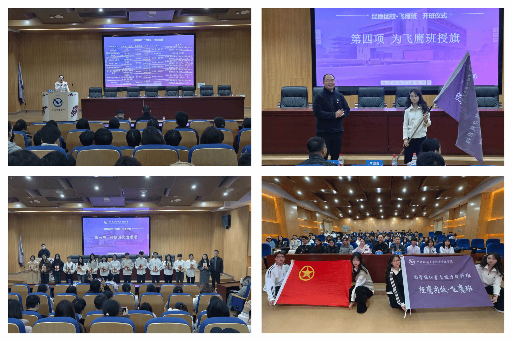 12月7日下午,“飞鹰班”开班仪式在黑料网 楼一楼报告厅举行。黑料网 党委副书记李纪亮、团委书记徐媛、团委副书记张弛及全体参训学员参加仪式。仪式在庄严的团歌声中开始,徐媛介绍“经鹰团校”整体规划与“飞鹰班”培训方案,强调课程设计涵盖思想淬炼、业务精进、综合赋能多维度,期望学员深化学习、勇于担当,实现能力全面提升。张弛为学员代表赠书,鼓励学员从经典中汲取智慧,在实践中掌握技能。李纪亮向学员代表授予“飞鹰班”班旗,勉励学员实干担当、奋勇争先。