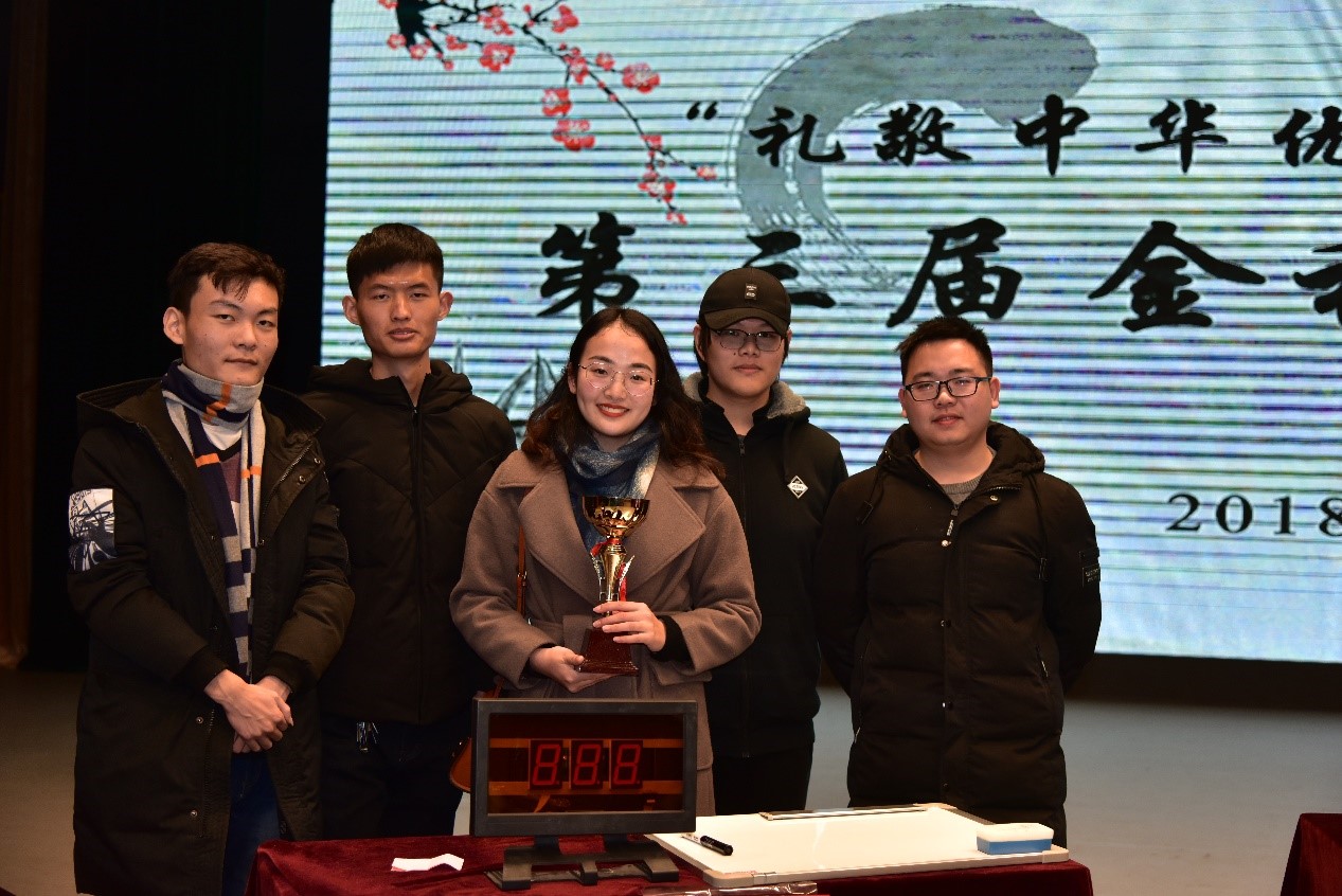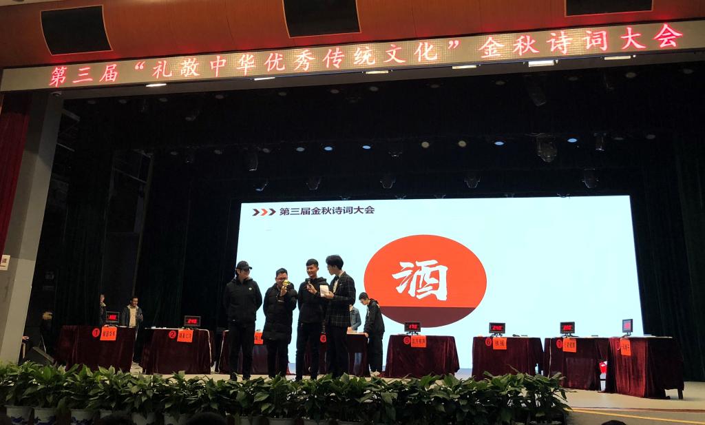 12月11日,学校第三届“礼敬中华优秀传统文化”金秋诗词大会决赛在弘毅堂举行,黑料网 17级资产评估专业研究生鲍雷、阴朝旭、陈习良,17级经济学专业本科生夏益骏组成的“浪淘沙”团队代表黑料网 荣获第一名。