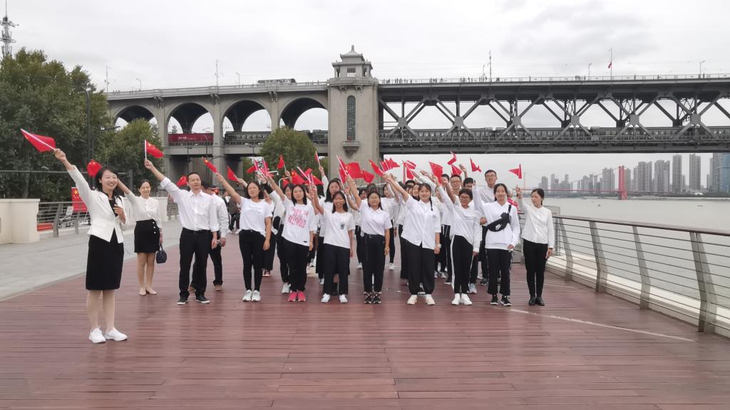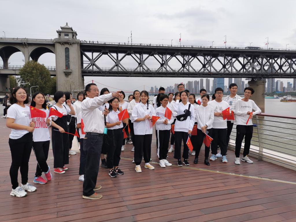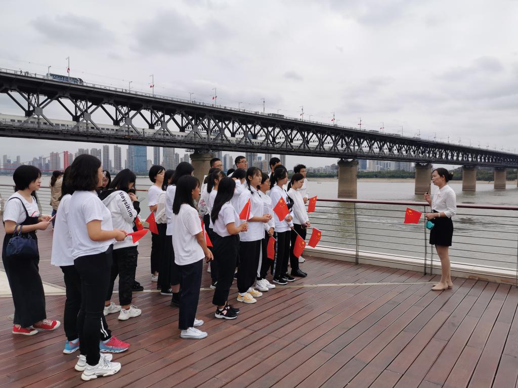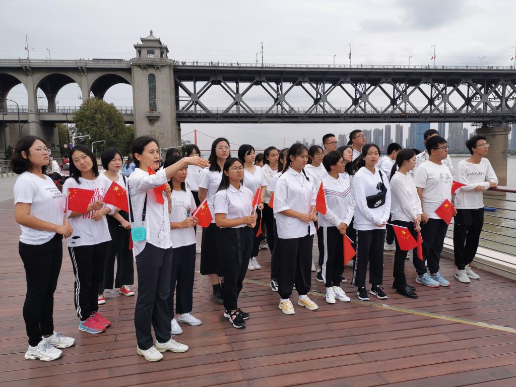 “风樯动,龟蛇静,起宏图。一桥飞架南北,天堑变通途……”在长江大桥武昌桥头堡上, 师生手中的鲜红国旗伴着毛泽东著名诗词《水调歌头•游泳》的齐声诵读、迎着飒爽江风漫展飘扬,师生们面对“龟蛇间一桥飞架,天堑通途楚天舒”的宏伟景观,心中的家国自豪感油然而生。旅游管理系教师支部党员、专业系主任肖拥军老师对全体学生说到: “长江大桥的建设成就是中华人民共和国成立70年以来取得的伟大成就的一个缩影,它实现了“一桥飞架南北,天堑变通途”的梦想,激发和点燃了中国人敢想敢干的满腔热情,弘扬了民族志气! 更是武汉辉煌的历史成就、 ‘敢为人先,追求卓越的’武汉精神的集中体现,我们一定要秉承这种精神奋勇向前。”