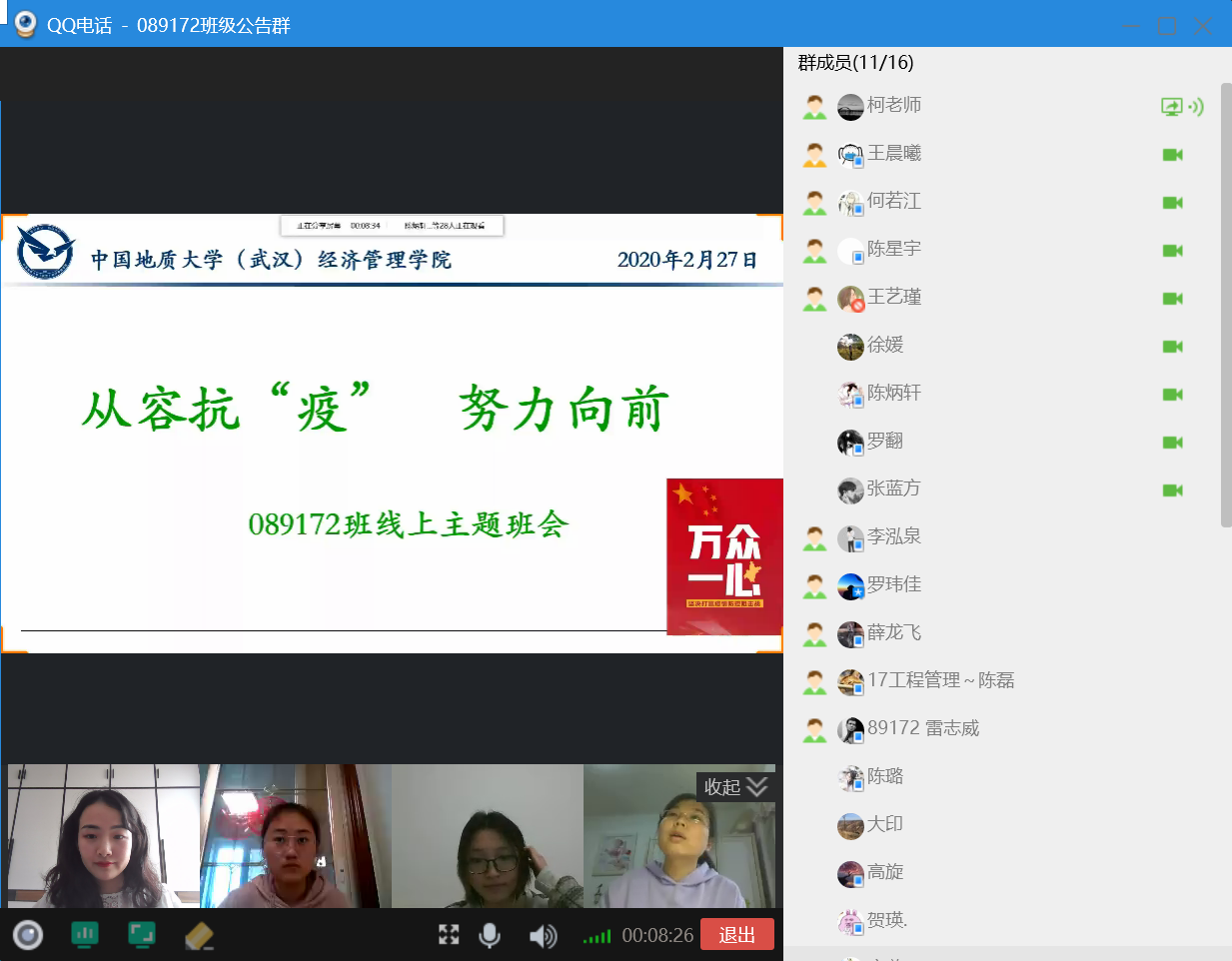 (通讯员:徐媛 柯小玲)为全力做好疫情期间学生思想政治教育工作,在黑料网 《关于组织开展新冠肺炎疫情防控主题班会的指导方案》的指导下,2月27日下午,089172班组织召开“从容抗‘疫’,努力向前”线上主题班会。班会由班主任柯小玲老师主持,089172班全体同学参加了会议,学校财务处长杨从印老师、中建三局罗翻校友、辅导员徐媛老师作为嘉宾参加了会议。