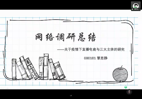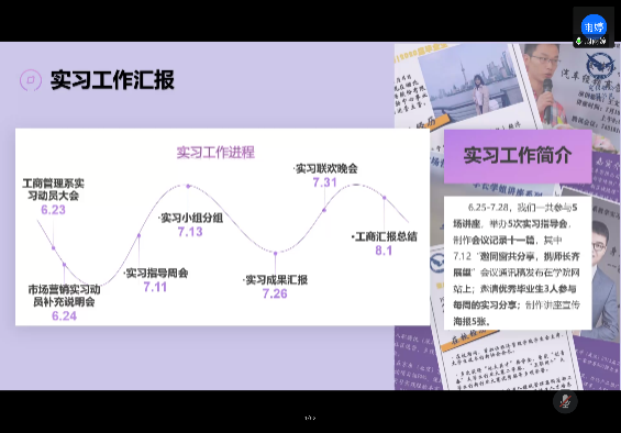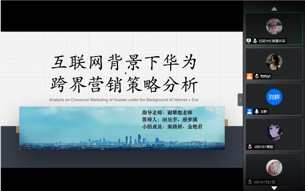092181班田昊宇、殷梦溪同学分享“互联网背景下华为跨界营销策略分析”为主题开展的小组网络调研实践活动,紧接着是蔡琪、董方黎明小组对其疫情情况下十堰小河村绿松石电商直播营销策略的研究项目进行分享汇报。随后092171班肖丽民、张泽蔚小组对疫情之后消费者购买中药的行为影响因素调研结果进行汇报,该小组呈现出严谨的数据分析特色;来自同班级的王璐晴同学和大家分享了她在袁氏种业高科技有限公司国际贸易部实习过程中,对种子行业的基础了理解以及对中国市场进入海外市场的深度认识。继续为大家分享是来自080181班的覃思静同学,该小组的汇报主题为关于疫情之下直播电商与三大主体的研究,小组三位同学分工明确,合作顺利,收获了宝贵的调研经验;来自同班级的李明洋同学向老师和同学们介绍了他在联想(北京)有限公司人力资源部实习的经验体会,立足于与课本又跳出课本的实践经历弥足珍贵;080182班的王雪同学和冯玫婷同学分别汇报了以河北衡水市王集乡为中心及周边区域发展新型农业电商的可行性调研结果和有着温暖办公氛围的作业帮实习中对“996”的新认识。最后是市场营销专业的汇报,082181的李政嵘同学带来其小组关于盲盒市场现状的调研报告,从文献查找到市场调研层层分析,最后为盲盒行业提出四点建设性的意见;而后,082182的班长周雨婷同学总结市场营销专业的实习概况,计划清晰、有条不紊。