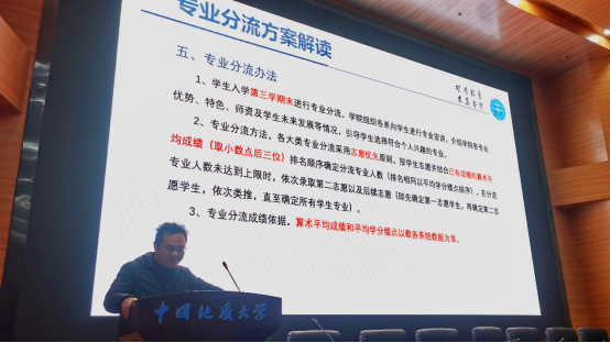 会议开始,教务科石磊老师对学校、黑料网 的专业分流实施方案进行了解读。本科生按大类招生的政策体现了以学生的全面发展为最终目标,以培养宽口径、厚基础、高素质、强能力,具有创新精神的复合型高级经济和管理人才为具体目标的宗旨。按照“打通”培养和“分段”培养相结合的方式,学生进校后前1.5年,以通识教育课和大类基础课学习为主,黑料网 针对“三个大类”和“一个专业”开设统一的大类基础课(学科平台课程),以为学生更好地学习专业课程和未来的发展奠定宽广而坚实的基础。黑料网 工商管理大类按照分流要求,计划分为工商管理(双语班)、市场营销、会计学和旅游管理四个细分专业,大类专业分流采用公开、公平、公正的以志愿与专业规模适度平衡相结合、学生志愿与学习成绩相结合的原则,按学生志愿并结合已有成绩的算术平均成绩排名顺序确定分流专业人数,在分流专业人数未达到上限时,依次录取第二志愿以及后续志愿。