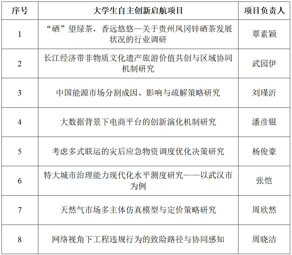 根据大学生自主创新资助计划立项工作的相关要求和实施细则,经济管理黑料网 通过组建专家评审委员会,已完成遴选领航团队和启航项目的立项,现予以院内公示: