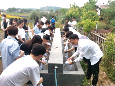 第一项活动是非物质文化遗产--扎染制作。扎染制作的重点在“扎”,由劳动实践基地工作人员为大家提前准备好了白色T恤、植物染料和橡皮筋等材料,再由专业老师讲解扎染手艺的原理后,展示了多种不同的扎染方式,同时鼓励同学们发散思维,积极探索更多的捆扎方式。老师和同学们纷纷尝试,在艺术细胞的碰撞后呈现出多样的作品。蓝天与田野相接,不同风格、不同样式的蓝色扎染T恤随风飘动,既增添了色彩,也赋上了更多生机。扎染体验充分展现出中华优秀传统文化魅力,也增添了本次实践行的乐趣。