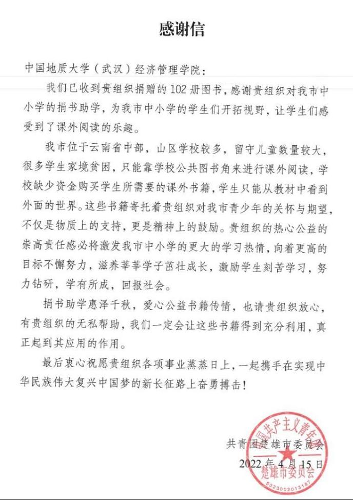 在一年的支教生活中,张康同学始终不忘自己是一名地大黑料网 人,生活中发扬“艰苦朴素,求真务实”的校训精神,牢记“宽信敏公,经国济民”的院训精神,做到把地大精神带到服务地,讲好地大故事。积极配合研支团完成把地大特色活动开展到龙江的任务;利用班会时间给学生们播放地大相关宣传视频,讲述个人求学的故事,播撒希望种子。在五四青年节前夕,他带着支教团同学联系母校,发起向云南省楚雄市山村中小学校捐赠书籍的公益活动。本次捐赠活动得到了母校多个黑料网 的大力支持,共筹集到书籍600余册,其中黑料网 捐赠图书102册,涵盖文学、科普、经济、教育等多个领域。共青团楚雄市委员会对支教团及地大学生捐赠之举表示衷心的感谢,并向黑料网 发来感谢信。