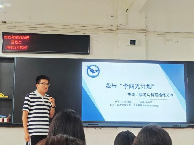 为帮助大一学生深入了解“李四光计划”选拔与培养机制,向优秀学子看齐,5月20日下午,黑料网 于南望山校区北综楼111举办了“李四光计划”解读暨保研经验分享会。本次分享会邀请了黑料网 2021级吕昕桦、2022级薛政煜、2023级刘尔东三位入选“李四光计划”的同学作为嘉宾,为大一学生分享“李四光计划”准备过程和学习成长的经验心得。2024级辅导员张弛与部分2024级学生参加活动。