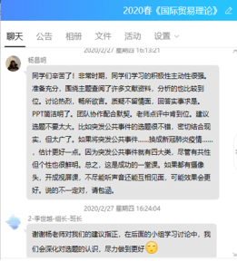 关心老师对教学硬件、软件的配备与使用,组织教师合理搭建教学资源。国贸系逐一落实老师们的在线教学硬件配备情况,鼓励支持老师利用多种智能设备开展教学准备工作。同时,国贸系组织老师交流各类网络软件的使用经验、技巧,提高教师团队对教学软件的使用普及度、熟练度,为实际教学扫清障碍。同时根据线上教学的特点与要求,组织教师合理搭建教学资源,包括:电子教材,辅助书籍、文献,课后作业,课堂测试,专题资料,慕课资源等。