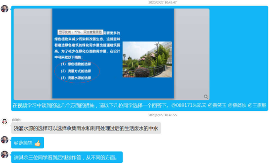 在线课堂互动是在线教学的难点,但在教师团队总结经验并自我改进后,形成了工程管理专业在线教育的一大亮点。为引导学生积极思考,工程管理系集思广益,共同商定多种互动方式。其一,以学生为主导,针对课程内容主动提问,老师在QQ 群中进行解答,解答的过程中也会引导其余同学继续思考相关问题。如在《工程质量与安全管理》的第一次课程中,有同学对“质量的固有特性”概念,对在上课过程中提到的案例有所疑问,老师于QQ 群中解答了该同学的疑问,同时询问学生对于案例的理解以引发讨论,课程结束后老师以文件形式再次发表自己的看法,鼓励学生进行讨论,以此加深同学们对于某些概念的理解。其二,以教师为主导,在无学生提问时采用引导的方式开始讨论。比如在《工程质量与安全管理》的第三次课程中,同学们一开始并没有提问题,老师就围绕之前谈到的质量固有特性的概念的相关知识,提问引起同学们的讨论。该方法能够继续加强同学们对于某个概念的理解,同时倡导同学们对于某个概念课堂上未讲到的知识,进行自主思考,抒发己见,提高同学们的自主学习能力。其三,教师点名讨论的方式开展课堂讨论。老师在PPT 视频里留一些当堂作业,涉及已学知识,在当次课程讨论环节,采用 QQ 点名回答的方式让同学们作答。以此作为变相点名,起到监督作用;同时也检查学生是否认真听课,并鼓励不喜远程交流的同学加入讨论,促进这部分同学提高学习积极性。